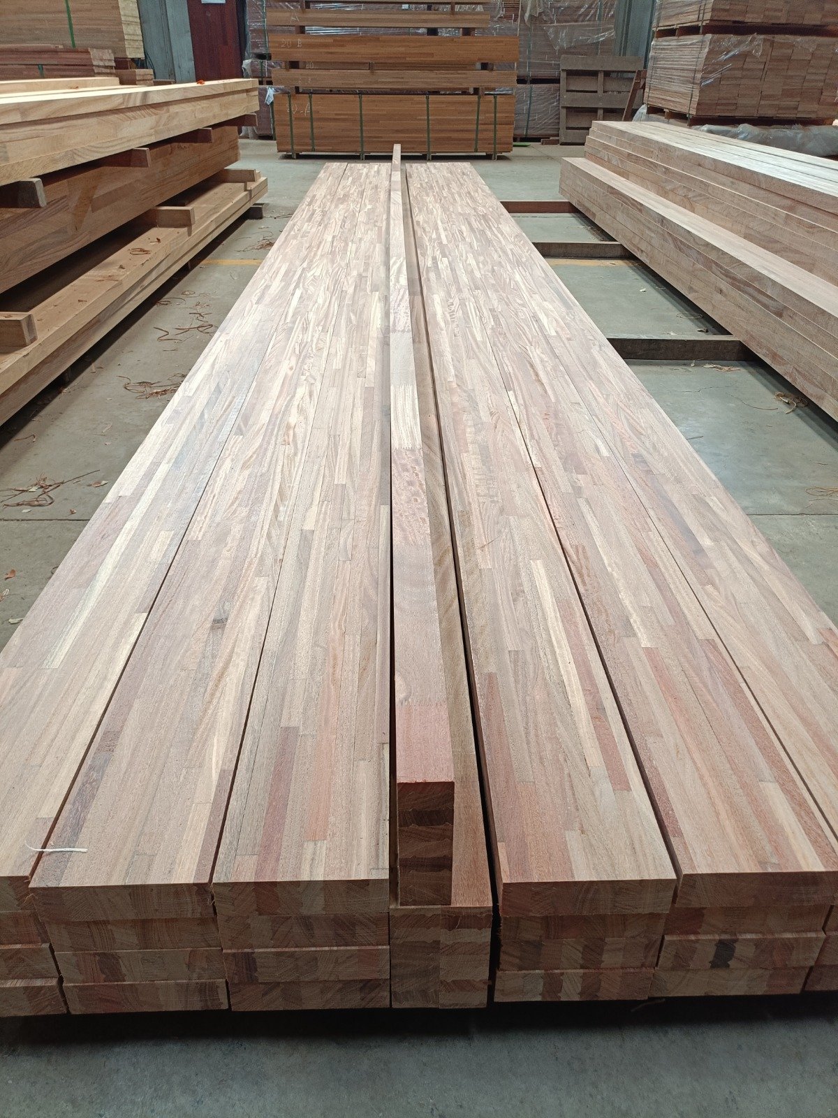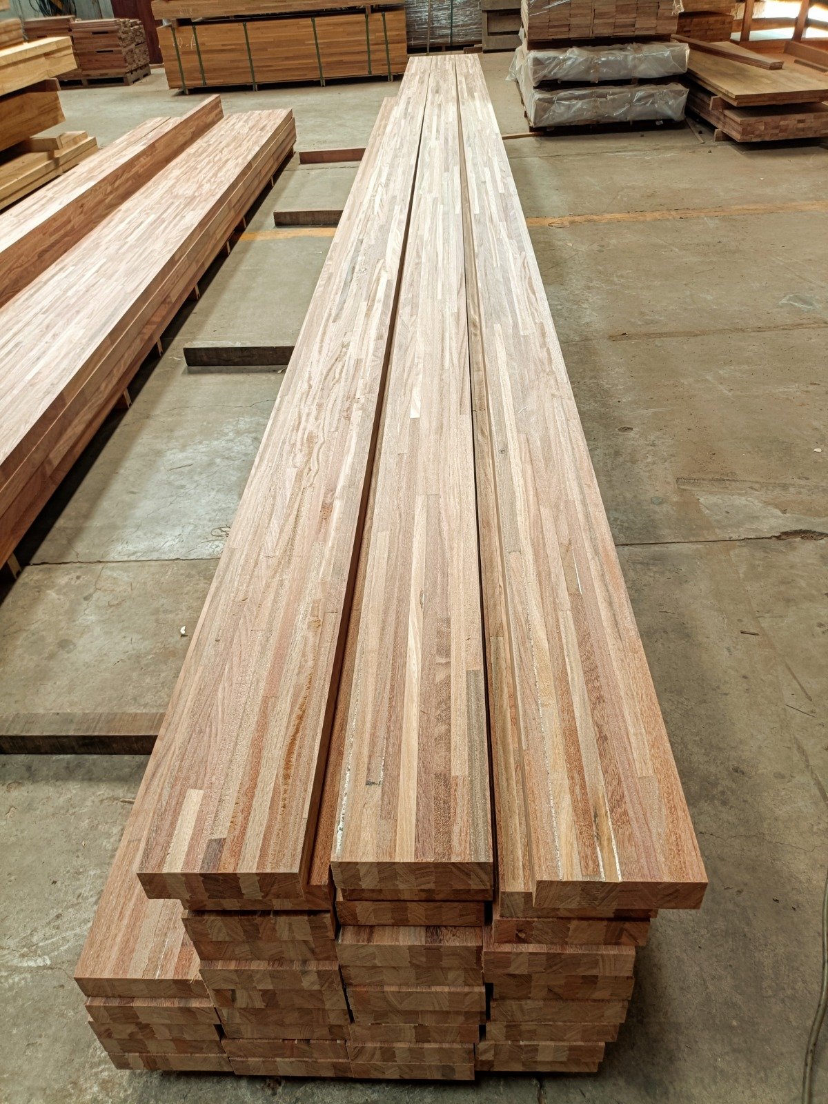 Vigas Finger Joint estructurales de madera de Cumarú. Calidad FAS. Densidad 970 kg/m3.